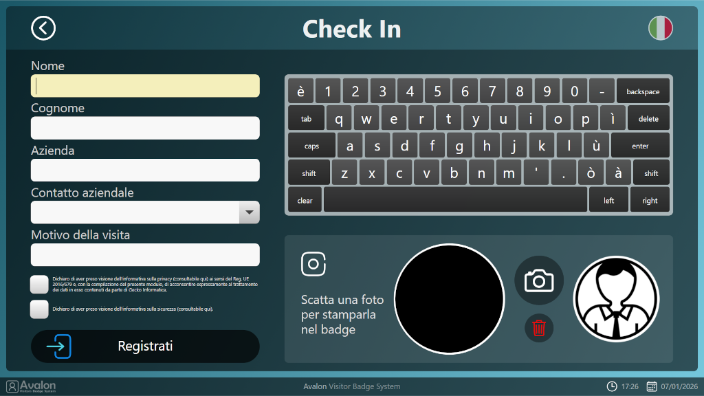 Grazie al sistema touchscreen, la registrazione del visitatore è veloce ed immediata.